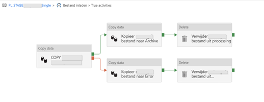 De PL_*_Single pipeline plaatst een extensie achter de variabele, checkt of het bestand bestaan en áls dat het geval is wordt de data verwerkt in de ‘True’ activiteit van de If Condition: