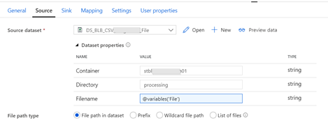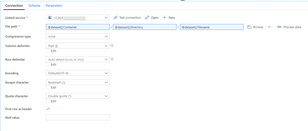 Omdat ieder bestand dat je inleest andere kolommen hebt, is de configuratie van de linker COPY-activiteit van de PL_*_Single pipeline een hele belangrijke. Daarvoor gebruik ik een dataset die overweg kan met de aangeboden CSV structuur. Let daarbij op dat je dataset aanmaakt met de juiste delimiters en text qualifiers. Als je vervolgens voor de (blob)container, directory en filename een parameter maakt, kun je deze dataset voor alle bestanden met dit type CSV structuur gebruiken.