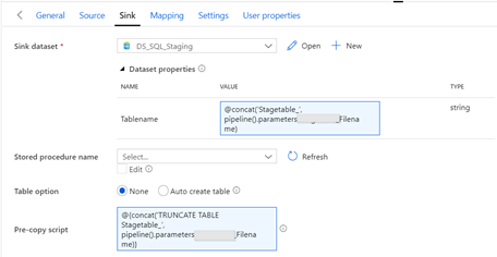 In de Sink zorg je vervolgens dat (o.b.v. de ingevoerde parameter Filename) de juiste tabel wordt gevuld. Je kunt als pre-copy script nog een truncate op de betreffende tabel uitvoeren. Je kunt hier ook een drop table (if exists) doen en auto create table aanzetten. Hierdoor klopt de structuur in je staging ook altijd met het bestand (niet altijd gewenst).